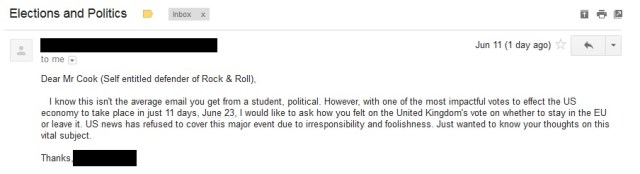 I know this isn’t the average email you get from a student, political. However, with one of the most impactful votes to effect [sic] the US economy to take place in just 11 days, June 23, I would like to ask how you felt on the United Kingdom’s vote on whether to stay in the EU or leave it. US news has refused to cover this major event due to irresponsibility and foolishness. Just wanted to know your thoughts on this vital subject.