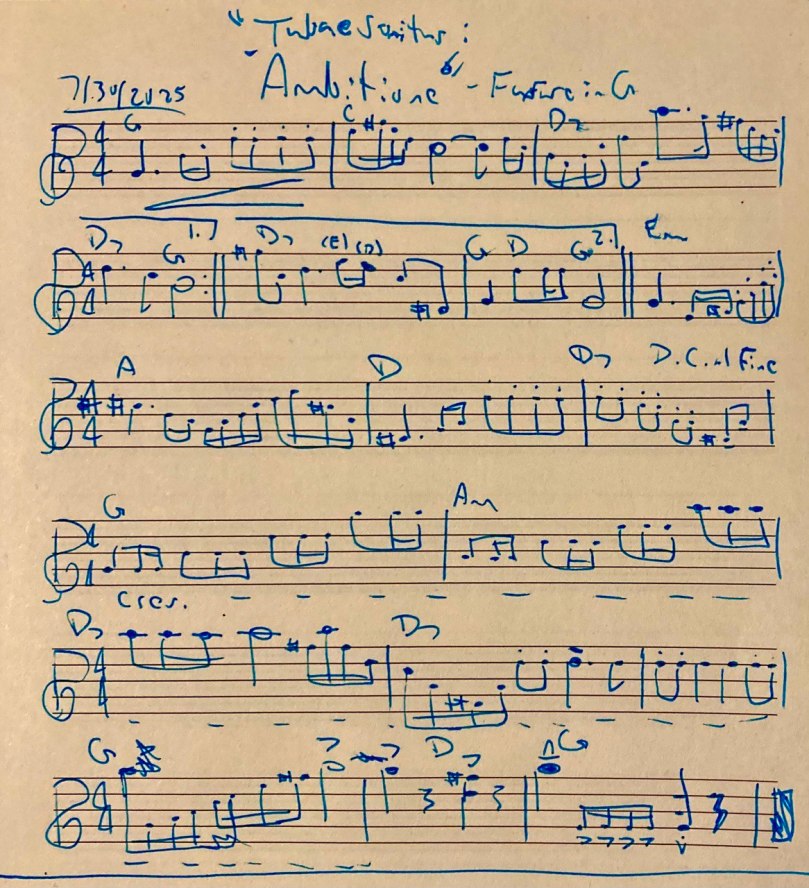 “Tubae Sonitus: Ambitione” is a march-like fanfare for brass quintet (two Bb trumpets, one trombone, one tuba).