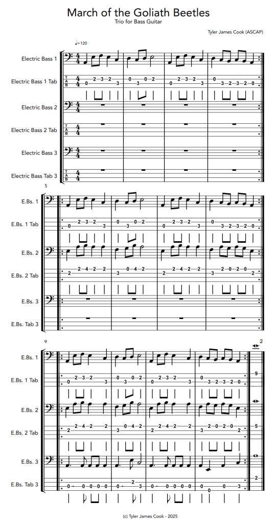 “March of the Goliath Beetles” is a short trio in A minor for three electric bass guitars. 🎸🪲
