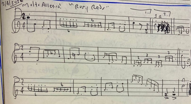 “Rosy Reds” is a piece for flute, marimba, and electric piano depicting the playful flitting of rosy red minnows in a koi pond.